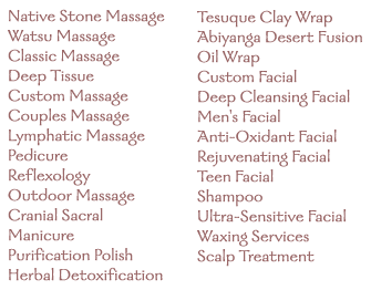 The Spa Treatment Menu offers a wide variety of services, each one created to invoke the bodies' natural healing response. From Native Stone Massage to the Tesuque Clay Wrap, Abiyanga to Desert Fusion, our treatments go beyond your highest expectations. |